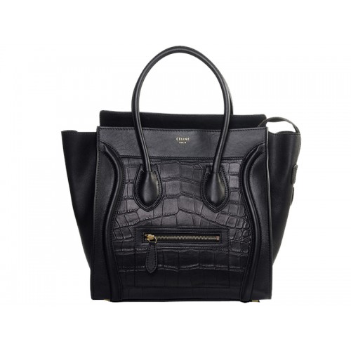 Střední taška Celine Luggage Tote z telecí kůže, černá s krokodílí kůží