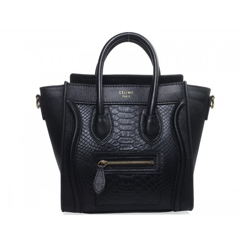 Celine Luggage Mini Tote z telecí kůže, černá s černou hadí kůží