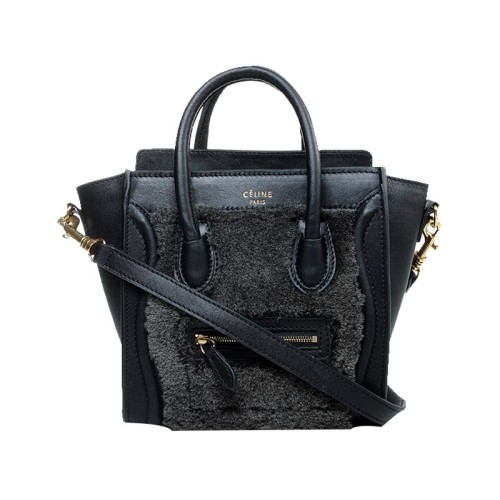 Celine Luggage Mini Tote z telecí kůže, černá/vlněná černá