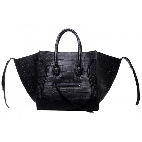 Celine Luggage Phantom Square Tote Bag Crocs Leather Black