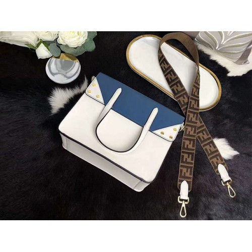 Střední taška. Dvojitá rukojeť, s klopou, která se po stranách skládá, umožňuje nosit tašku ručně, nebo ji nosit na rameni nebo příčném těle díky odnímatelným ramenním popruhům. Podšívka s plochou kapsou. Vyrobeno ze směsi béžové a tmavě modré telecí kůže. Zdobené mikro plochými cvočky. Stuhový ramenní popruh s motivem FF. Kovové zboží se zlatým povrchem.