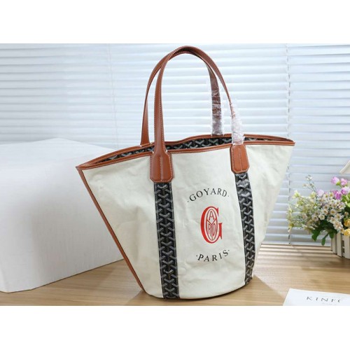 Limitované vydání. Z obchodu Maison Goyard Biarritz 2017. Slonovinová a vícebarevná ručně malovaná plátěná taška Goyard Belharra Biarritz potažená Goyard Belharra Biarritz se skořicovým koženým lemem a kontrastním prošíváním, dvojité ploché ramenní popruhy, oboustranný vnitřek z krémového plátna s přízvukem 'Biarritz' vpředu a otevřený nahoře. Nakupujte kabelky Goyard a sbírejte je všechny.