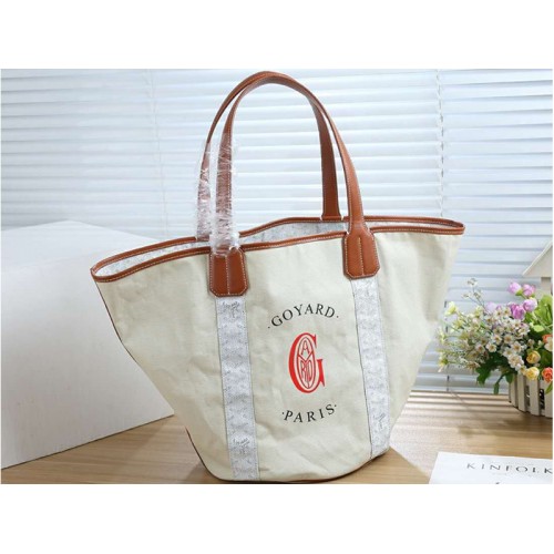 Limitované vydání. Z obchodu Maison Goyard Biarritz 2017. Slonovinová a vícebarevná ručně malovaná plátěná taška Goyard Belharra Biarritz potažená Goyard Belharra Biarritz se skořicovým koženým lemem a kontrastním prošíváním, dvojité ploché ramenní popruhy, oboustranný vnitřek z krémového plátna s přízvukem 'Biarritz' vpředu a otevřený nahoře. Nakupujte kabelky Goyard a sbírejte je všechny.