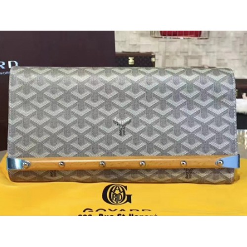 Tato superstylová velká spojka je vyrobena z klasického plátna Goyard chevron. Tato velká spojka má obkladovou klapku s dřevěným boferem a stříbrné cvočky se stříbrnými konci. Klapka se otevírá do látkového interiéru pro denní nebo večerní potřeby od Goyarda!