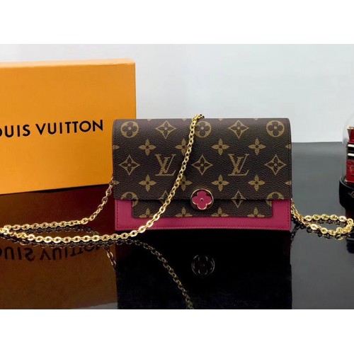 Kombinování plátna Monogram a telecí kůže, peněženka Flore řetěz má výraznou sponu ve tvaru Monogram Flower. Tento ženský design je dostatečně velký, aby pojal smartphone i další každodenní nezbytnosti, a lze jej nosit jako spojku na rameni nebo přes tělo.