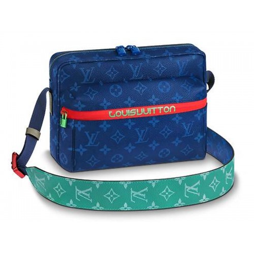 Tento Messenger Monogram Pacific Outdoor, který představuje nový technický, sportovně inspirovaný pocit, který Kim Jones odhalila na výstavě jaro-léto 2018, mísí klasické plátno potažené Monogramem a Pacific Monogrand se sportovními popruhy, potápěčskými zipy, šňůrkami a modrou, zelenou a červenou barvou. kovové kousky. Snadný a funkční tvar příčného tělesa.