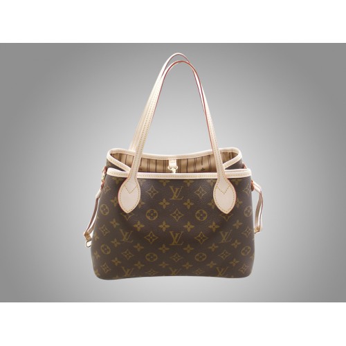 Na plátně Monogram je tato verze Neverfull malá verze z rodiny. Vyznačuje se stejnou pruhovanou plátěnou podšívkou klasických kmenů domu