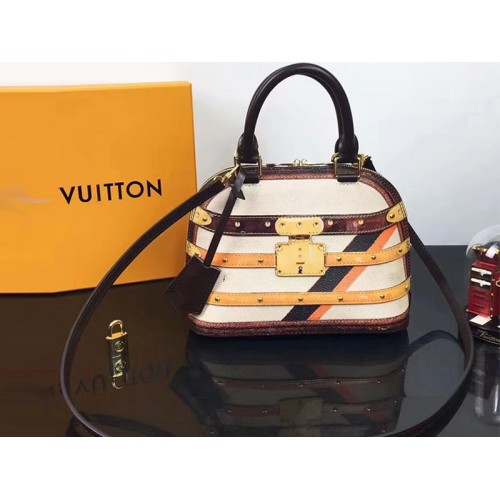 Kabelka Alma BB Time Trunk je drobnou poctou dědictví výroby kufrů domu. Kombinace teletiny kůže a transformované plátno s malované, proužkové detaily vytvořit elegantní trompe l’oeil efekt. Kartáčovaný hardware zlaté barvy zvýrazňuje jeho podzimní mozaiku barev. Horní rukojeti a odnímatelný kožený řemínek nabízejí více možností nošení.
