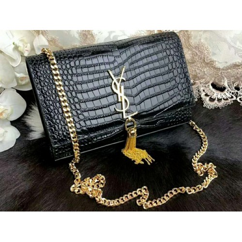 Saint Lauren Kate Medium s třásněmi z krokodýlí kůže, lesklá černá